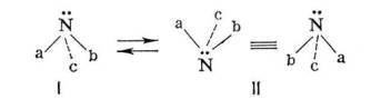 2) Переход конфигурации молекулы, содержащей трёхвалентный «пирамидальный» атом (например, азота или мышьяка), в зеркально противоположную. Так, для молекулы с трёхвалентным азотом формы I и II – антиподы оптические :