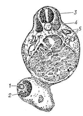 Образование линзы глаза в чуждом ему месте у зародыша обыкновенного тритона, которому был пересажен зачаток глаза альпийского тритона: 1 – индуцированная линза; 2 – пересаженный глаз; 3 – спинной мозг; 4 – хорда; 5 – почечные канальцы зародыша-реципиента.