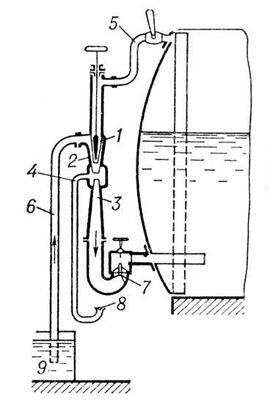 Схема работы инжектора: 1 – паровой конус; 2 – водяной конус; 3 – нагнетательный конус; 4 – вестовая труба; 5 – паропровод; 6 – труба; 7, 8 – клапаны; 9 – бак.