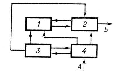 Блок-схема инерциальной навигационной системы: 1 – блок инерциальных измерителей и построителей направлений в пространстве (акселерометры и гироскопические устройства), посредством которого реализуется заданная ориентация измерительных осей и с которого выдаётся измерительная информация в вычислитель; 2 – вычислительный блок, в котором осуществляются интегрирование основного уравнения, вычисление необходимых параметров движения, формирование сигналов (в некоторых инерциальных навигационных системах) управления ориентацией инерциальных измерителей и сигналов компенсации систематических погрешностей (ускорения тяготения, поворотного ускорения, от несферичности Земли и др.); 3 – блок времени, из которого в блоки 1, 2, 4 поступают сигналы мирового времени; 4 – блок ввода начальной информации в блоки 1 и 2 для ориентации инерциальных измерителей и интегрирования основного уравнения; А – поступление начальной информации; Б – выдача конечной информации о параметрах движения. Стрелками показаны направления поступления информации.