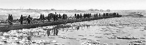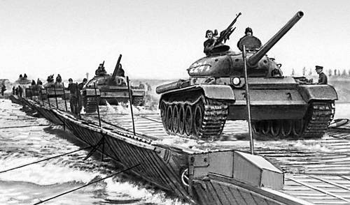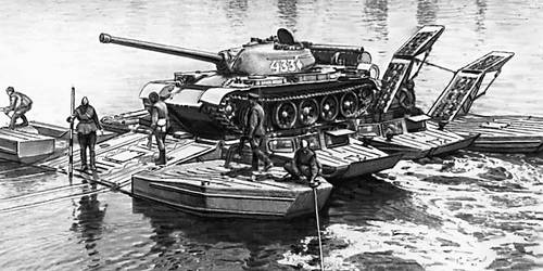 Переправа танков по наплавному мосту, наведённому из понтонного парка.