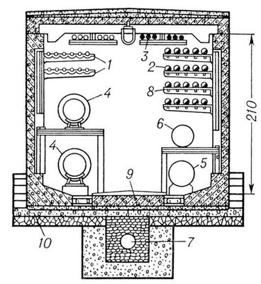 Размещение инженерных коммуникаций в подземном коллекторе: 1 – кабели связи; 2 – кабели силовые; 3 – кабели внутреннего обслуживания коллектора; 4 – трубопроводы тепловой сети; 5 – водопровод; 6 – канализация; 7 – дренажная труба; 8 – металлические полочки; 9 – железобетонные блоки; 10 – бетонная подготовка.