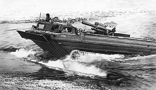 Переправа артиллерийского орудия на плавающем транспортёре.