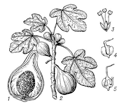 Инжир: 1 – разрез соцветия; 2 – ветка с плодами; 3 – тычиночный цветок; 4, 5 – пестичные цветки.