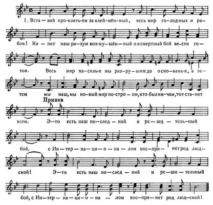 «Интернациона'л» (франц. L’Internationale, от лат. inter – между и natio – нация, народ), международный пролетарский гимн, партийный гимн КПСС и др. коммунистических партий. Текст Э. Потье (1871, опубликован в 1887), музыка П. Дегейтера (1888). Впервые исполнен 23 июня 1888 лилльским хором рабочих хорового общества «Лира трудящихся» на празднике продавцов газет и в том же году издан в Лилле отдельной листовкой тиражом 6 тыс. экземпляров (издатель Больдодюк). С начала 1890-х гг. «И.» быстро распространился среди рабочих округов Северной Франции и Бельгии, а после 1-го конгресса 2-го Интернационала (Париж) – за пределы Франции и Бельгии и стал звучать в качестве международного гимна революционной борьбы пролетариата. В 1894 французский социалист Госелен был приговорён к тюремному заключению за 2-е музыкальное издание «И.» (поводом для репрессии послужила 5-я строфа «И.», созвучная антимилитаристической кампании, проводившейся 1-м Интернационалом). Первые переводы текста «И.» появились в 1890-х гг. Начало всемирному распространению «И. » и переводу его текста на языки почти всех народов мира положила Великая Октябрьская социалистическая революция. Музыка «И.» получила вторую историческую жизнь в новой хоровой редакции и со слегка измененной мелодией, сложившейся на русской почве в первые годы Советской власти.