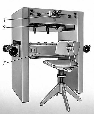 Интерпретоскоп: 1 – наблюдательная система; 2 – каретка с объективами; 3 – станина со световым столом.