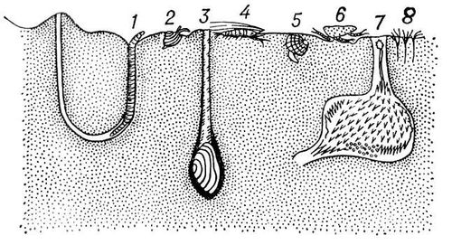 Типичные представители инфауны: кольчатые черви – 1 – пескожил, 8 – Pygospio; двустворчатые моллюски – 2 – макома, 3 – мия, 5 – сердцевидка; ракообразные – 4 – креветка Crangon, 6 – бокоплав Gammarus; иглокожие – 7 – сердцевидный морской ёж.