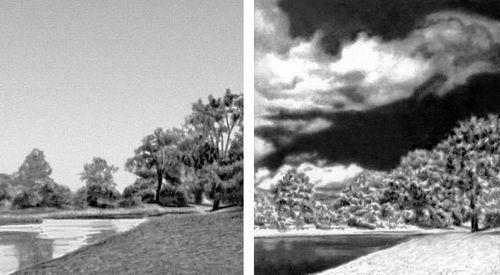 Фотографии ландшафта: слева – на обычной пластинке, справа – на инфракрасной пластинке. Листья деревьев отражают инфракрасное излучение и поэтому на фотографии справа кажутся светлыми, вода поглощает инфракрасное излучение – на снимке выходит темной; небо также выходит темным, т.к. оно не рассеивает инфракрасное излучение.