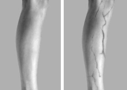Фотография ноги: слева – в видимом, справа – в инфракрасном излучении; на последней отчетливо видны вены.