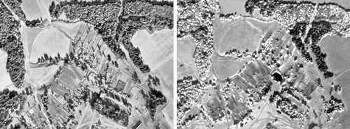 Аэроснимки одного и того же участка местности: слева – обычный, справа – инфрахроматический. На рисунке справа деревья четко разделены на хвойные (более тёмные) и лиственные (светлые), тёмное пятно в центре – водоём, который на обычном снимке сливается с общим фоном.