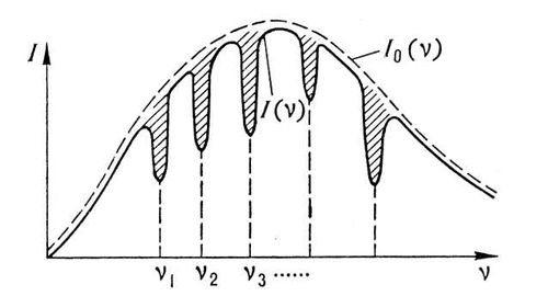 Зависимость интенсивности падающего I (n) и прошедшего через вещество I(n) излучения. n1 , n2 , n3 ,... – собственные частоты вещества; заштрихованные области – полосы поглощения.