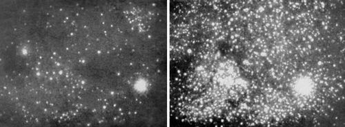 Фотографии участка неба: слева – в видимом излучении, справа – в инфракрасном излучении. На фотографии слева большая часть звезд не видна, т.к. они закрыты туманностью, непрозрачной для видимого излучения. Для инфракрасного излучения туманность прозрачна и потому на фотографии справа видно большое число «инфракрасных» звёзд.