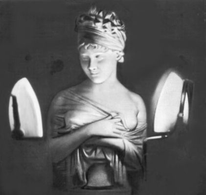 Фотография, полученная в полной темноте, при облучении скульптуры излучением от двух нагретых утюгов. Утюги на фотографии получились светлыми.