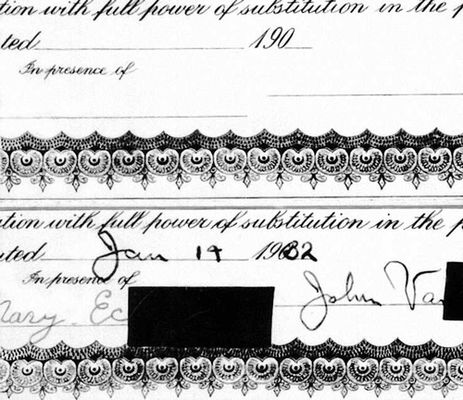 Фотографии части сертификата с обесцвеченной химически подписью и датой: вверху – в видимом свете, внизу – в инфракрасном излучении; на последней видны уничтоженные первоначально подпись и дата.