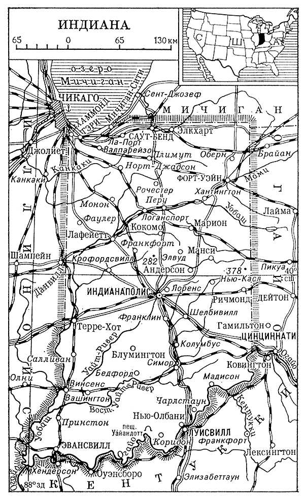 Индиа'на (Indiana), штат на С. США, между озером Мичиган и р. Огайо. Площадь 94 тыс. км2. Население 5,2 млн. чел., в том числе городского 65% (1970). Административный центр и крупнейший город – Индианаполис. Поверхность слегка волнистая, полого понижающаяся к Ю.-В.; наивысшая точка 378 м над уровнем моря. Климат умеренно-континентальный, с жарким летом. Осадков около 1000 мм в год.