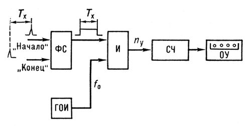 Такие Ц. и. у. применяются преимущественно для измерения интервалов времени, частоты и др. физических величин с промежуточным преобразованием их в интервал времени. На рис. 1 показана схема такого Ц. и. у. Измеряемый интервал времени Тх ограничивается моментами появления двух электрических импульсов – «начало» и «конец». По этим импульсам формирователь вырабатывает строб-импульс длительностью Тх , который поступает на один из входов совпадений схемы ; на др. её вход подаются импульсы с высокой частотой повторения f , вырабатываемые генератором опорных импульсов. Число импульсов ny на выходе схемы совпадений, подсчитанное счётчиком, равно ny = S[f (Tx ]. При ny /f0 << Tx число nx можно принять за значение измеряемого интервала. Счётчик опорных импульсов вырабатывает также код, соответствующий числовому значению интервала Тх .