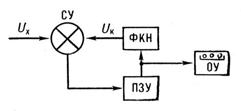 Рис. 2. Схема цифрового вольтметра постоянного тока: СУ – сравнивающее устройство; ФКН – формирователь компенсирующего напряжения; ПЗУ – программное запоминающее устройство; ОУ – отсчетное устройство; Ux – измеряемое напряжение; Uк – компенсирующее напряжение.