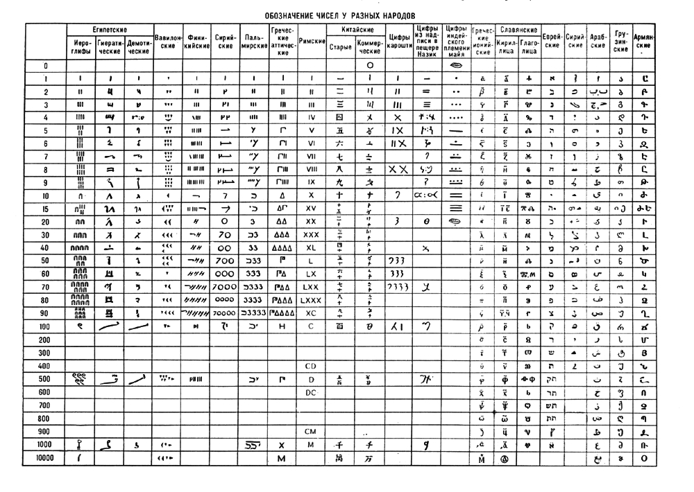 Нумерациями типа египетской иероглифической являются финикийская, сирийская, пальмирская, греческая, аттическая или геродианова. Возникновение аттической нумерации относится к 6 в. до н. э.: нумерация употреблялась в Аттике до 1 в. н. э., хотя в других греческих землях она была задолго до этого вытеснена более удобной алфавитной ионийской нумерацией, в которой единицы, десятки и сотни обозначались буквами алфавита. все остальные числа до 999 – их соединением (первые записи чисел в этой нумерации относятся к 5 в. до н. э.). Алфавитное обозначение чисел существовало также и у др. народов; например у арабов, сирийцев, евреев, грузин, армян. Старинная русская нумерация (возникшая около 10 в. и встречавшаяся до 16 в.) также была алфавитной с применением славянской азбуки кириллицы (реже – глаголицы, см. Славянские цифры ). Наиболее долговечной из древних цифровых систем оказалась римская нумерация, возникшая у этрусков около 500 до н. э.: она употребляется иногда и в настоящее время (см. Римские цифры ).