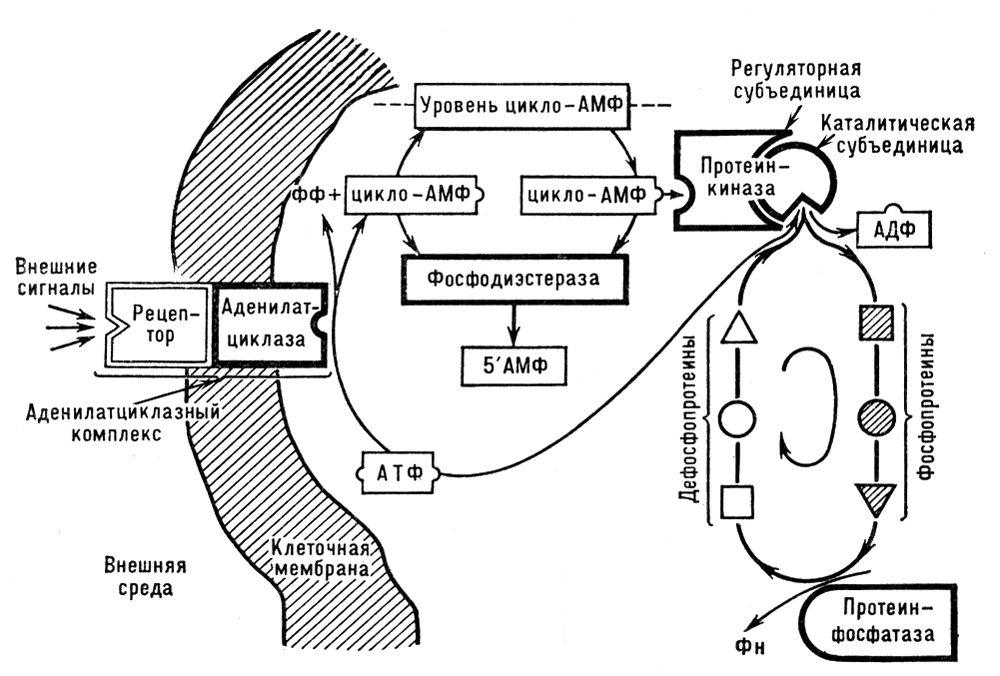 Концентрация цАМФ в тканях млекопитающих очень мала и составляет десятые доли микромоля на 1 кг сырой ткани (10-7 —10-6моль ). При активации аденилатциклазы, катализирующей биосинтез цАМФ, или блокировании фосфодиэстеразы, осуществляющей гидролиз этого нуклеотида, концентрация цАМФ в клетке быстро увеличивается. Т. о., содержание цАМФ в клетке определяется соотношением активностей этих двух ферментов. Связь между гормоном или др. химическим сигналом (первый «посредник») и цАМФ (второй «посредник») осуществляет т. н. аденилатциклазный комплекс, включающий рецептор, настроенный на определённый гормон (или др. биологически активное вещество) и расположенный на внешней стороне клеточной мембраны, и аденилатциклазу, расположенную на внутренней стороне мембраны. Гормон, взаимодействуя с рецептором, во многих случаях активизирует аденилатциклазу, которая катализирует биосинтез цАМФ. Концентрация цАМФ, образующегося т. о. в клетке, превышает концентрацию действующего на клетку гормона в 100 раз. В основе механизма действия цАМФ в тканях животных и человека лежит его взаимодействие с протеинкиназами – ферментами, активность которых проявляется в присутствии этого нуклеотида (см. схему ). Связывание цАМФ с регуляторной субъединицей протеинкиназы приводит к диссоциации фермента и активации его каталитической субъединицы, которая, освободившись от регуляторной субъединицы, способна фосфорилировать определённые белки (в т. ч. ферменты). Изменение свойств этих макромолекул путём фосфорилирования меняет и соответствующие функции клеток. Например, при действии адреналина на клетки печени происходит фосфорилирование двух ферментов – фосфорилазы и гликогенсинтетазы. Фосфорилаза при этом активируется, что приводит к быстрому гидролизу гликогена – запасного вещества печени. Одновременно с началом гидролиза гликогена прекращается его новый синтез, т.к. фермент, участвующий в его образовании, – гликогенсинтетаза при фосфорилировании его протеинкиназами теряет свою активность. Один и тот же гормон, действуя через посредство цАМФ, в разных тканях вызывает различные функциональные ответы, зависящие от особенностей данной ткани. При стрессе, когда потребность в энергии очень велика, мозговой слой надпочечников в повышенном количестве образует гормон адреналин. В печени адреналин обусловливает активное расщепление (фосфоролиз) гликогена, образование фосфорных эфиров глюкозы и выброс в кровь большого количества глюкозы, в жировой ткани – приводит к гидролизу липидов, достигнув сердца, – увеличивает силу сокращения сердечной мышцы, усиливает кровообращение и улучшает питание тканей, осуществляя мобилизацию всех сил организма. цАМФ играет определённую роль в морфологии, подвижности, пигментации клеток, в кроветворении, клеточном иммунитете, вирусной инфекции и др. Некоторые медиаторы, например ацетилхолин, могут ускорять образование др. Ц. н. – 3',5'-гуанозинмонофосфата (цГМФ), который синтезируется в клетке из гуанозинтрифосфата при активации фермента гуанилатциклазы, входящей в гуанилатциклазный комплекс, расположенный в клеточной мембране. Характерно, что многие эффекты цГМФ прямо противоположны эффектам цАМФ. Антагонистические отношения Ц. н. проявляются чаще всего в сложных системах, когда для регуляции клеточной функ
