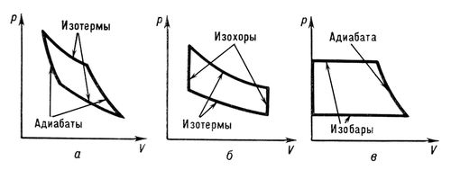 Термодинамические циклы в системе координат объем (V) – давление (r): а – Карно; б – Клайперона; в – Клаузиуса-Ранкина.