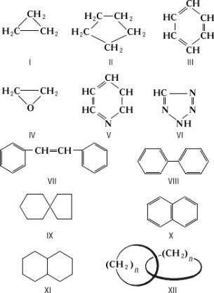 Наиболее распространены (вследствие лёгкости образования и отсутствия напряжения в циклах) 5– и 6-звенные кольца. В зависимости от природы атомов, образующих циклы, Ц. с. подразделяют на изоциклические, или карбоциклические соединения , циклы которых состоят только из атомов углерода, например алициклические соединения — циклопропан (1) и циклопентан (II), ароматические соединения – бензол (III); гетероциклические соединения , в циклах которых, кроме углерода, имеется также один или несколько атомов др. элементов, т. н. гетероатомов, главным образом кислорода, азота, серы, например этилена окись (IV), пиридин (V), тетразол (VI). В многоядерных Ц. с. кольца могут быть изолированными друг от друга, как, например, в стильбене (VII), связанными одной простой связью, как в дифениле (VIII), иметь один общий атом [(IX), см. Спираны ] или два (т. н. конденсированные Ц. с.), например нафталин (X), декалин (XI). Особый случай Ц. с. – катенаны (XII), молекулы которых построены по принципу обычной цепи (звено в звене). Примером неорганических Ц. с. могут служить некоторые соединения бора, например боразол, фосфора, например фосфонитрилхлориды, кремния – циклосплоксаны. См. также Органическая химия .
