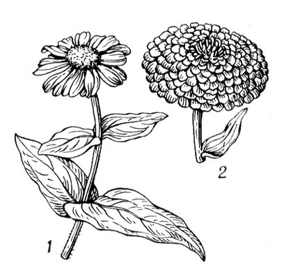 Циния изящная: 1 – немахровое соцветие; 2 – махровое соцветие.