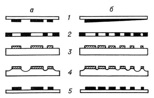 Схема изготовления штрихового (а) и растрового (б) клише: 1 – оригинал; 2 – негатив; 3 – кислотоупорная копия на металле; 4 – вытравленное клише; 5 – оттиск с готового клише.