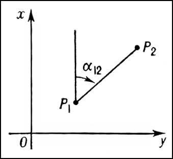 Дирекцио'нный у'гол (от франц. direction – направление), угол, характеризующий направление произвольной прямой относительно исходного направления и, в частности, относительно оси координат. В геодезии различают Д. у. на эллипсоиде и Д. у. на плоскости (проекции или топографической карты). На плоскости Д. у. a12 в точке P1 направления Р1Р2 на точку P2 определяют как угол в P1 (по часовой стрелке) между прямой, параллельной оси абсцисс Ох и направлением P1P2. Являясь одним из основных понятий в геодезии, Д. у. используется также в артиллерии, навигации и др.