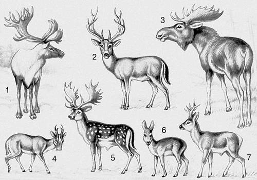 Олени: 1 – северный; 2 – американский чернохвостый; 3 – лось; 4 – мунтжак; 5 – лань; 6 – водяной олень; 7 – косуля.