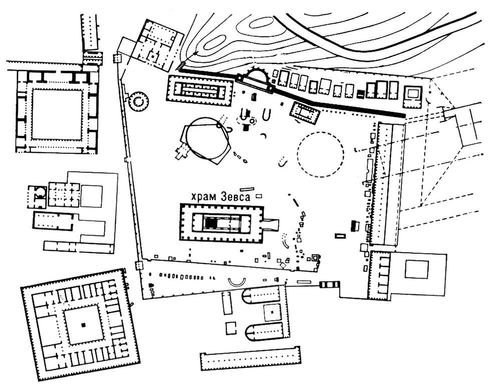 Олимпия. План священного участка Зевса с прилегающей местностью.