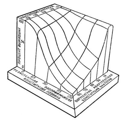 Таким образом, степень естественной устойчивости к заболеванию животных данного вида определяется многими факторами, суммарно отражая особенности конституции и животного, и возбудителя заболевания. Трёхмерная модель этих взаимоотношений представлена на рис., где показано, что процент особей, выживших после инфекции, зависит как от наследственной устойчивости организма к возбудителю заболевания, так и от вирулентности последнего.