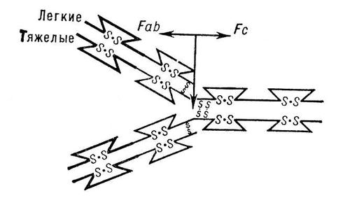 Схема молекулы иммуноглобулина G. Показаны две тяжёлые и две лёгкие полипептидные цепи, соединённые межцепьевыми дисульфидными связями. Лёгкая цепь состоит из 2, тяжёлая – из 4 структурных единиц (петель), образованных внутрицепьевыми дисульфидными связями. Жирными линиями обозначены N-кoнцевые участки цепей, стрелкой – участок, чувствительный к протеолитическому расщеплению, в результате которого молекула распадается на два Fab —фрагмента, сохраняющих активность антител, и на Fc —фрагмент.