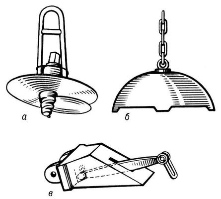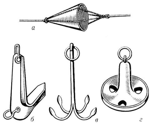 Рис. 4. Якоря специального назначения: а – плавучий; б – ледовый; в – «кошка»; г – якорь-гриб.