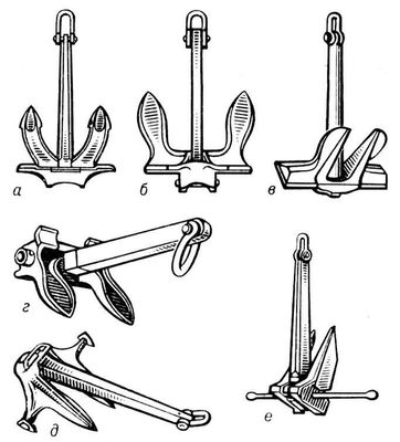 Рис. 2. Типы конструкций современных судовых якорей: а – Холла; б – Болдта; в – Грюзона—Хейна; г – Байерса; д – Матросова; е – Дэнфорда.
