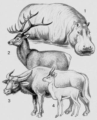 Млекопитающие. Парнокопытные: 1 – бегемот; 2 – олень; 3 – буйвол; 4 – джейран.