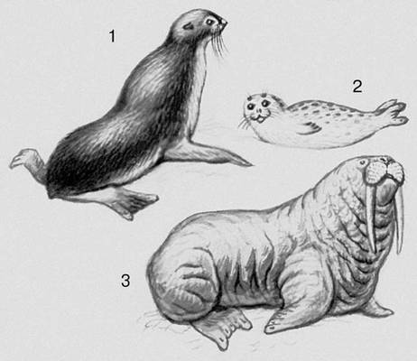 Млекопитающие. Ластоногие: 1 – морской котик; 2 – тюлень; 3 – морж.