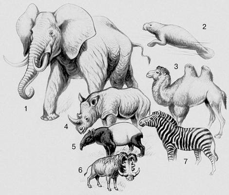 Млекопитающие. Хоботные: 1 – африканский слон. Сирены: 2 – ламантин. Мозоленогие: 3 – верблюд. Непарнокопытные: 4 – носорог; 5 – тапир; 6 – бородавочник. Парнокопытные: 7 – зебра.