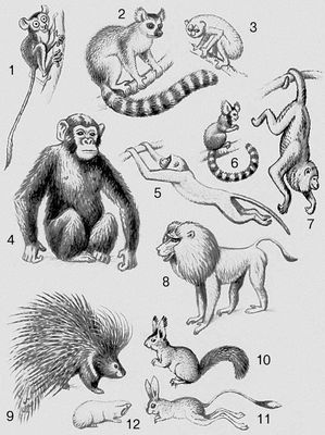 Млекопитающие. Приматы: 1 – долгопят; 2 – лемур коата; 3 – тонкий лори; 4 – шимпанзе; 5 – мартышка; 6 – игрунка; 7 – ревун; 8 – павиан. Грызуны: 9 – дикобраз; 10 – белка; 11 – тушканчик; 12 – слепыш.