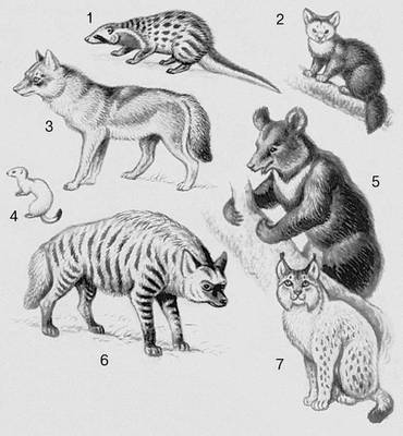 Млекопитающие. Хищные: 1 – циветта; 2 – соболь; 3 – волк; 4 – горностай; 5 – медведь; 6 – гиена; 7 – рысь.