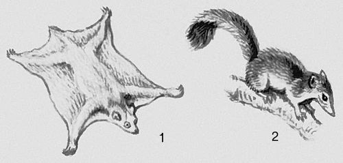 Млекопитающие. Шерстокрылы: 1 – Шерстокрыл. Приматы: 2 – тупайя.