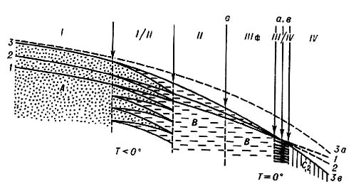 Зоны льдообразования и строение поверхностного слоя стационарного ледника (в сухих холодных районах). Зоны льдообразования: I – рекристаллизационная; II – холодная инфильтрационная; IIIл – ледяного питания; IIIф – тёплая инфильтрационная; IV – зона абляции. Границы: а – питания, б – фирновая, в – изотермы 0° на глубине затухания годовых температурных колебаний. Строение поверхностного слоя: А – снег, рекристаллизационные фирн и лёд; В – инфильтрационный фирн и лёд; C1 – наложенный лёд; С2 – глубинный лёд. Границы слоев (Толщина слоев на схеме дана приближённо; масштаб по вертикали в зонах I – IV различен): 1, 2, 3в – трёх последних лет накопления (пунктиром – стаивания) в конце лета. 3а – наибольшая высота поверхности снега последнего года, 3б – наибольшая высота поверхности наложенного льда последнего года. Т – температура.