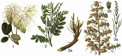 1 – скумпия кожевенная; 2 – солодка голая, 2а – корневище с корнями; 3 – солянка Рихтера (ветвь с плодами); 3а – ветвь с цветками; 3б – цветок.