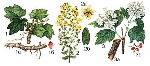 Лекарственные растения: 1 – заманиха высокая, 1а – корневище с корнями, 1б – плод; 2 – зверобой продырявленный, 2а – цветок, 2б – лист; 3 – калина обыкновенная, 3а – отрезок коры, 3б – плоды.