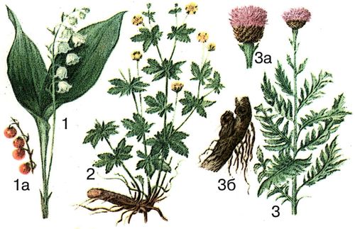 Лекарственные растения: 1 – ландыш майский; 1а – плоды; 2 – лапчатка прямостоячая; 3 – левзея сафлоровидная; 3а – соцветие (корзинка); 3б – корневище с корнями.
