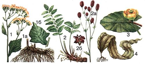 1 – крестовник широколиственный; 1а – корневище с корнями; 1б – средний стеблевой лист; 2—2а – кровохлебка аптечная; 2б – цветок; 3 – кубышка желтая; 4 – ламинария японская.