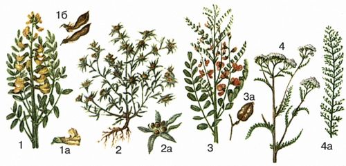 1 – софора толстоплодная, 1а – цветок; 2 – сушеница топяная, 2а – корзинки с верхними листьями; 3 – сферофиза солонцовая, 3а – плод; 4 – тысячелистник обыкновенный; 4а – лист.