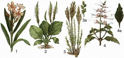1 – олеандр обыкновенный; 2 – подорожник большой; 3 – полынь цитварная, 3а – корзинки; 4 – почечный чай, 4а – лист.