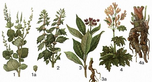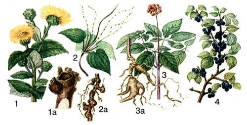 1 – девясил высокий, 1а – корень; 2 – диоскорея кавказская, 2а – корневище; 3 – женьшень, 3а – корневая сиситема; 4 – жестер слабительный.