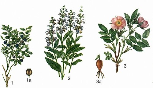 1 – черника обыкновенная, 1а – ягода (продольный разрез) ; 2 – шалфей лекарственный; 3 – шиповник коричный, 3а – плод.