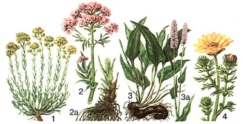 1 – бессмертник песчаный; 2 – валериана лекарственная; 2а – корневище с корнями и основанием побега; 3—3а – горец змеиный (змеевик); 4 – горицвет (адонис) весенний.